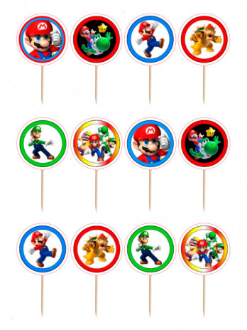 Conjunto de 12 toppers artesanais para cupcakes, doces, fingerfood ou salgadinhos com o tema Super Mário e os famosos Mário e Luigi. Inclui 6 desenhos sortidos.
