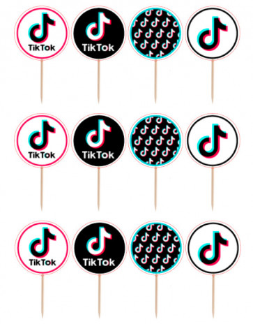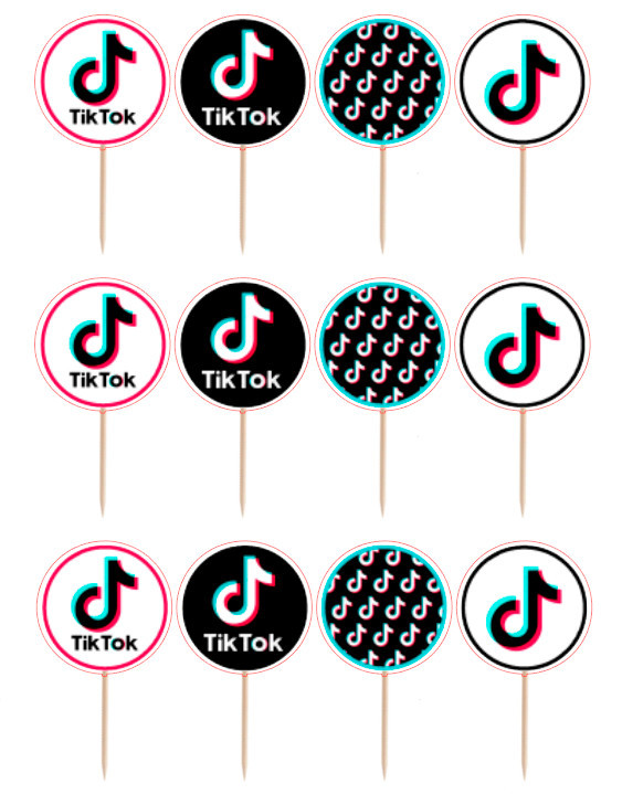 Conjunto de 12 toppers artesanais para cupcakes ou para decorar outros elementos com o tema Tik Tok. Inclui 4 desenhos sortidos.