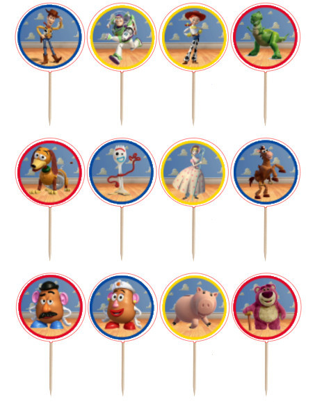 Conjunto de 12 mini toppers artesanais do Toy Story para cupcakes, salgadinhos ou finger food. Um complemento de decoração ideal para a festa de aniversário.