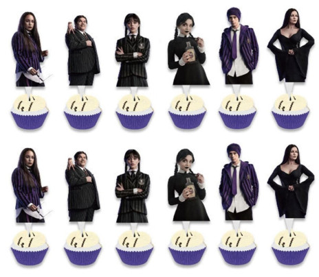 Conjunto de 12 mini toppers para cupcakes, docinhos ou finger food com o tema da série Wednesday.