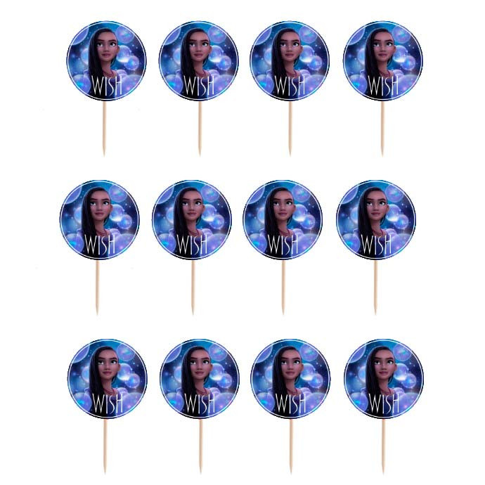 Conjunto de 12 toppers artesanais para cupcakes, doces, fingerfoods ou salgadinhos com imagem da Asha do filme disney Wish.
