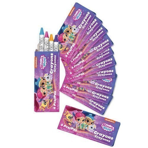 Embalagem com 12 caixinhas de 4 lápis de cera , para colorir da série Shimmer e Shine, ideais para colocar nos saquinhos de brindes na tua festa de aniversário.