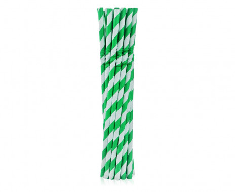 Conjunto de 12 palhinhas de papel de cor verde com listas brancas com cerca de 20cm de comprimento. As palhinhas são flexíveis e biodegradáveis.