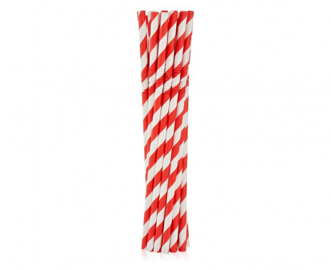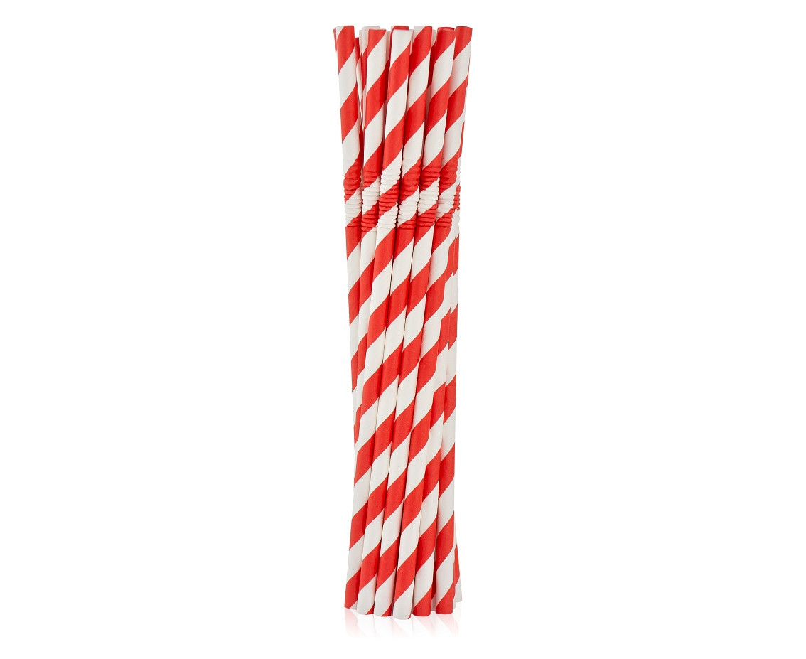 Conjunto de 12 palhinhas de papel de cor vermelha com listas brancas com cerca de 20cm de comprimento. As palhinhas são flexíveis e biodegradáveis.