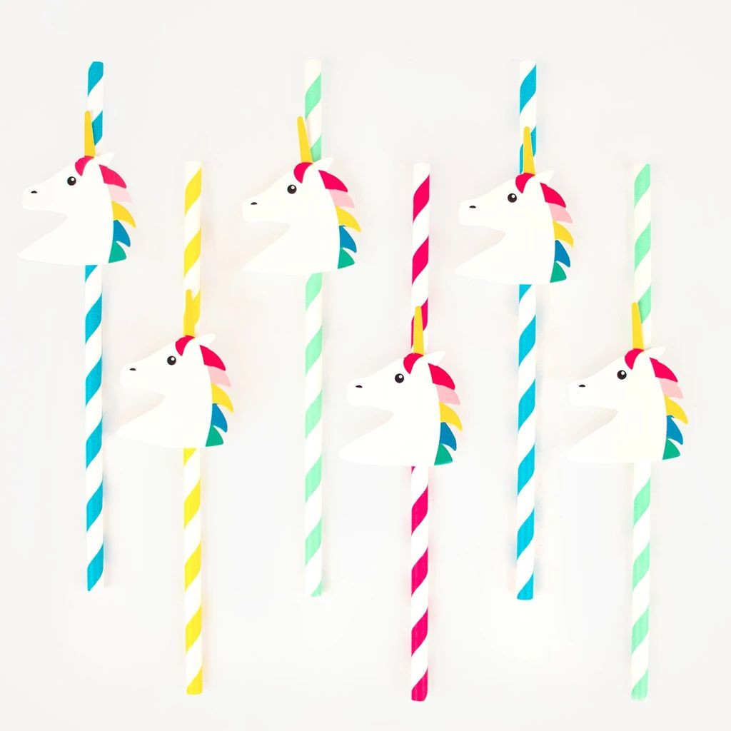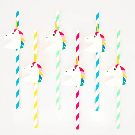 Conjunto de 12 palhinhas de papel coloridas para a decoração da mesa nas festas de aniversário com o tema dos unicórnios. Os toppers das palhinhas têm a forma de cabeça de unicórnio.