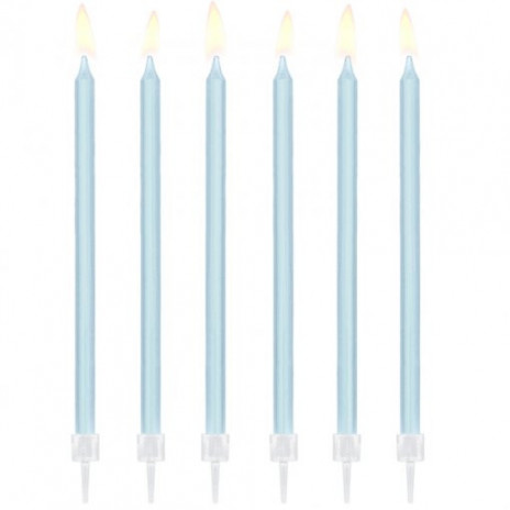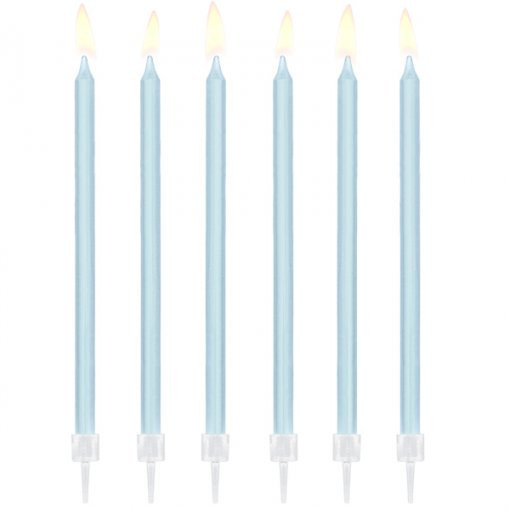 Conjunto de 12 velas lisas azuis claras com suporte, ideais para qualquer bolo de aniversário.