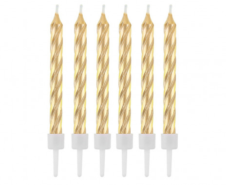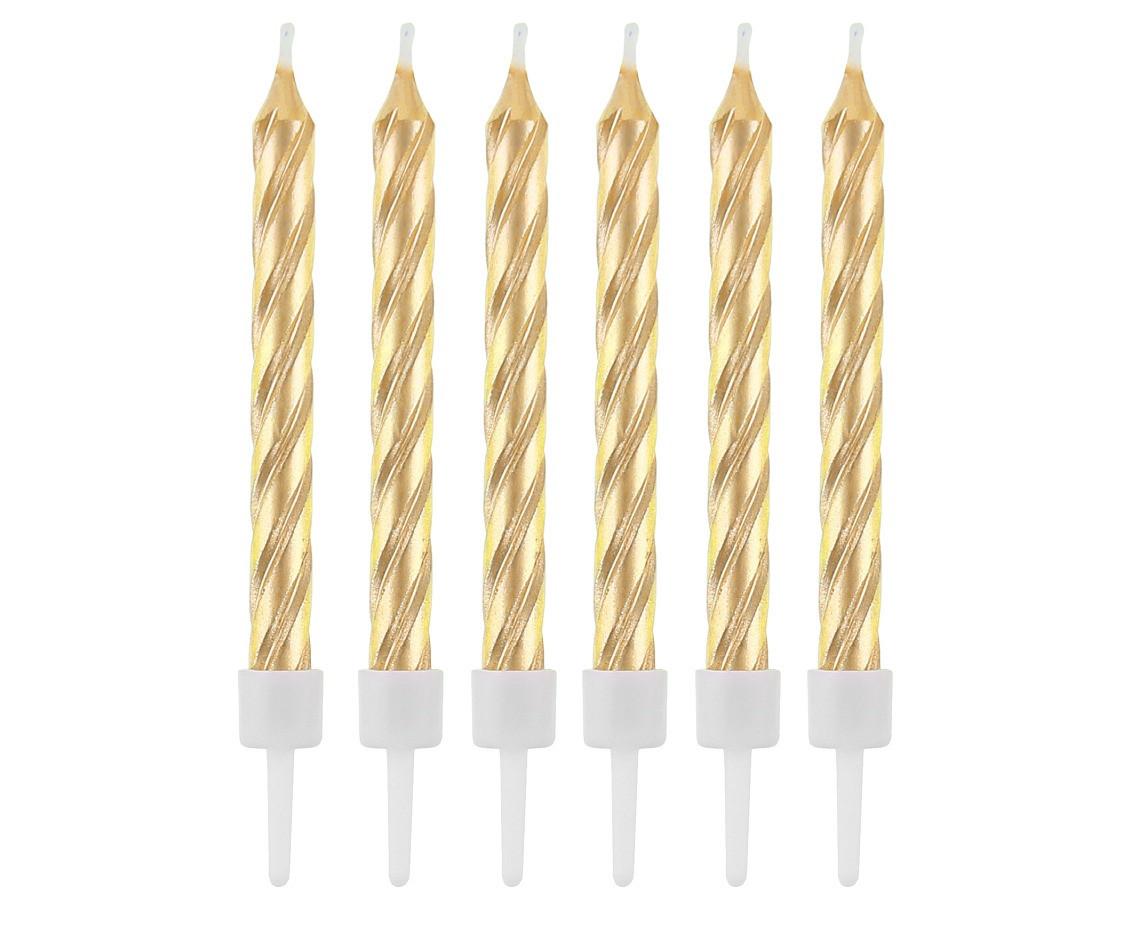 Conjunto de 12 velas em dourado com relevo com suporte branco, ideais para qualquer bolo de aniversário.