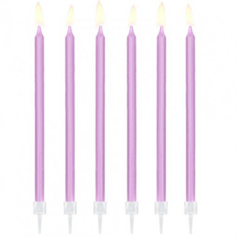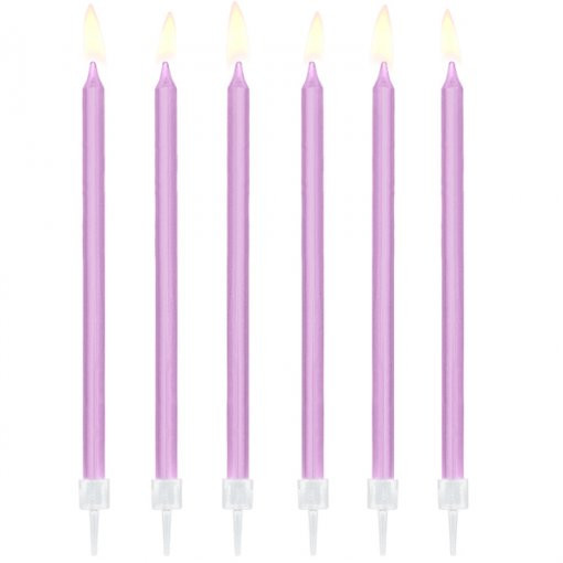 Conjunto de 12 velas lisas lilás com suporte, ideais para qualquer bolo de aniversário.