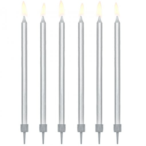 Conjunto de 12 velas lisas prateadas com suporte, ideais para qualquer bolo de aniversário.