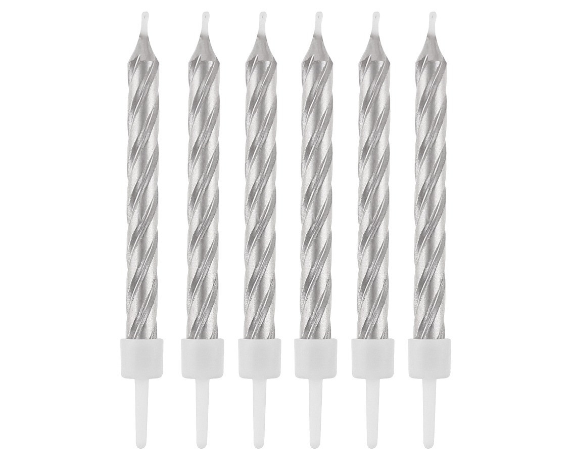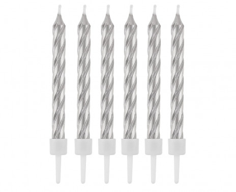 Conjunto de 12 velas em prateado com relevo com suporte branco, ideais para qualquer bolo de aniversário.