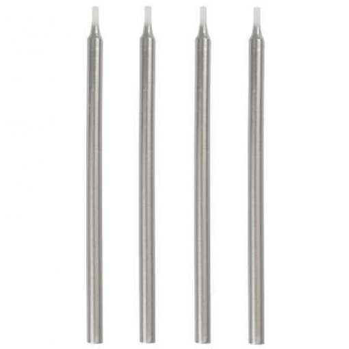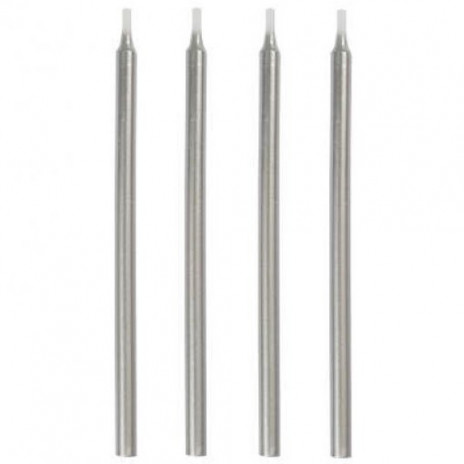 Conjunto de 12 velas lisas em prateado ideais para qualquer bolo de aniversário.