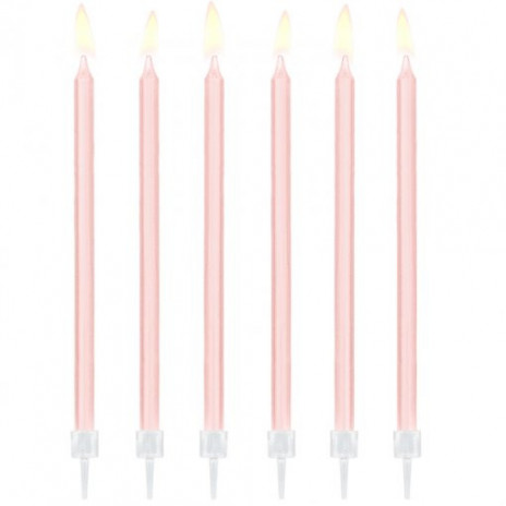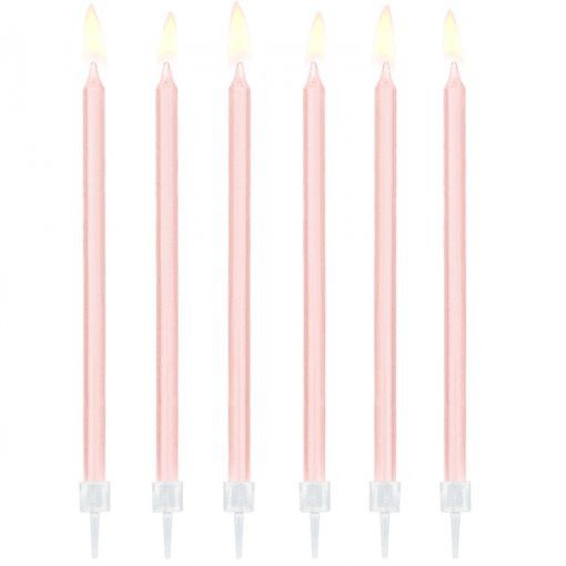Conjunto de 12 velas lisas rosas claras com suporte, ideais para qualquer bolo de aniversário.