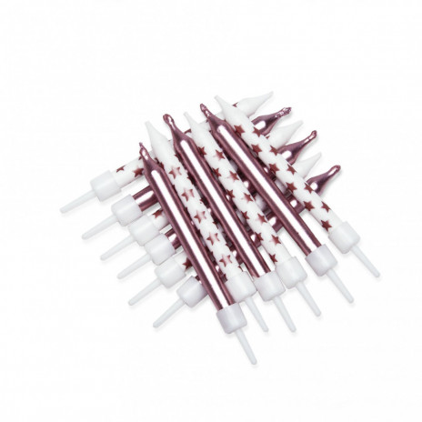 Conjunto de 12 velas com estrelas rose gold com suporte branco, ideais para qualquer bolo de aniversário.