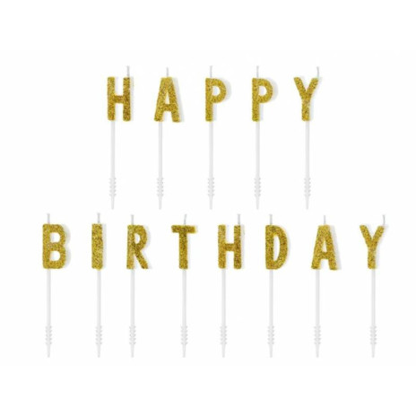 Velas de aniversário individuais com as letras H-A-P-P-Y B-I-R-T-H-D-A-Y em cor dourada brilhante.
