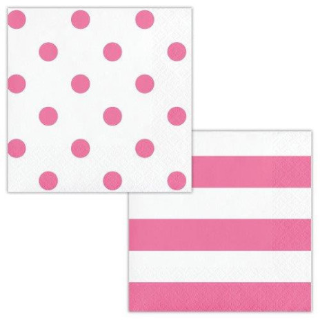 Pack de 16 guardanapos pequenos em papel com folha dupla em cor de rosa com bolinhas e riscas.