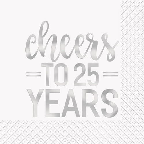 Pack de 16 Guardanapos de papel de folha dupla, com bolinhas prateadas de um lado e do outro menção ao 25 anos , com as medidas de 16.5cm x 16.5cm