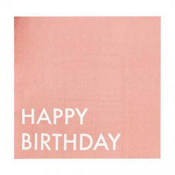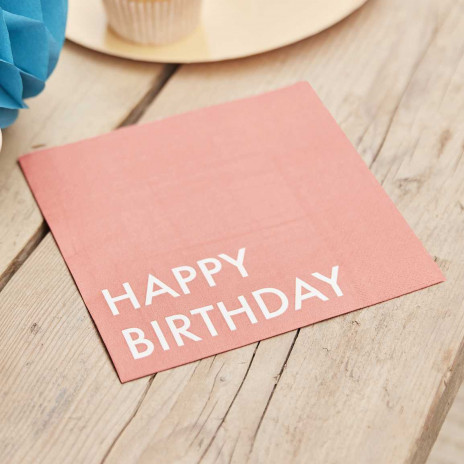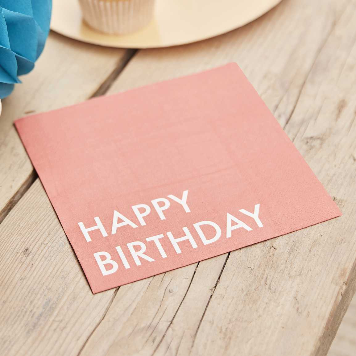 Pack de 16 guardanapos de papel para decoração de qualquer mesa de aniversário, em vermelho com a inscrição "Happy Birthday".