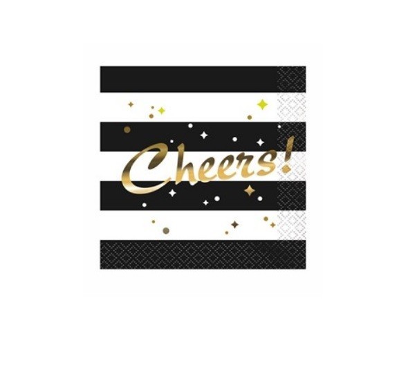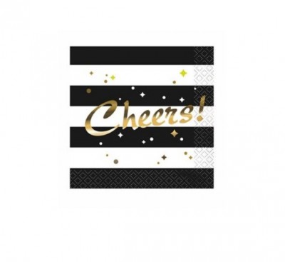 Elegantes guardanapos de papel ideais para um coquetel! Os guardanapos são projectados com um padrão de listras preto e branco e a palavra 'Felicidades' em ouro metálico.Perfeito para juntar-se ao resto da gama Chic Party.