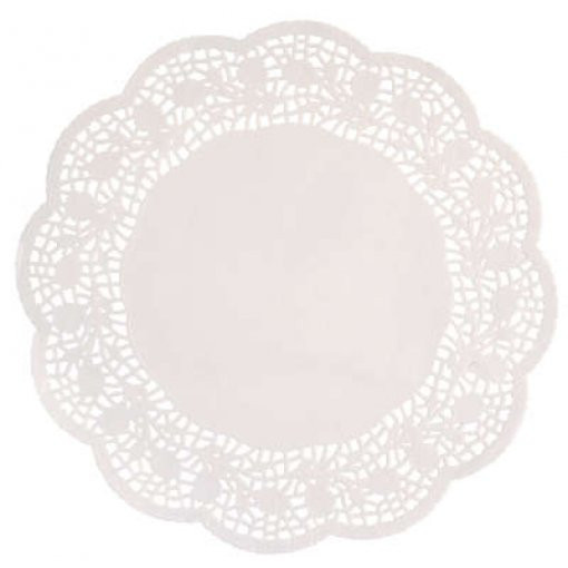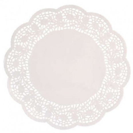 Conjunto de 16 unidades de naperons de papel brancos com cerca de 27cm de diâmetro.