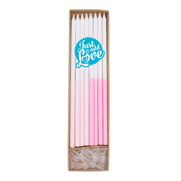 Conjunto de 16 velas altas com dois tons de rosa com glitter para decoração de qualquer bolo. Com suporte para o bolo.