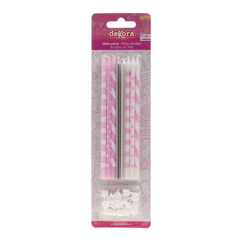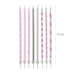Conjunto de 16 velas altas em rosa com vários padrões, ideais para qualquer bolo de aniversário. Com suporte para o bolo.