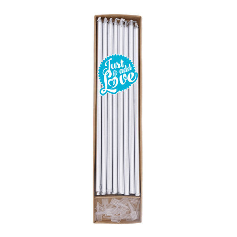 Conjunto de 16 velas altas em prateado para decoração de qualquer bolo. Com suporte para o bolo.