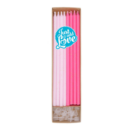 Conjunto de 16 velas altas com dois tons de rosa com pormenores em dourado para decoração de qualquer bolo. Com suporte para o bolo.