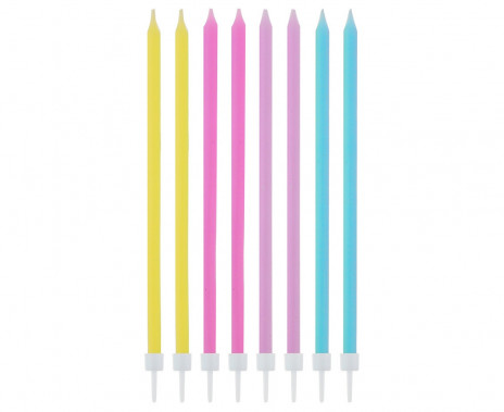 Conjunto de 16 velas com cores sortidas pastel com suporte branco, ideais para qualquer bolo de aniversário.