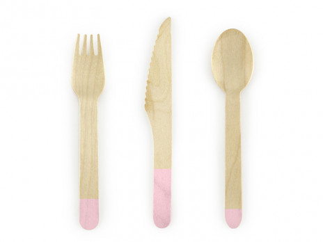 Talheres em madeira com pequeno apontamento em rosa claro para complementar qualquer mesa. Inclui 6 facas, 6 garfos e 6 colheres amigos do ambiente.
