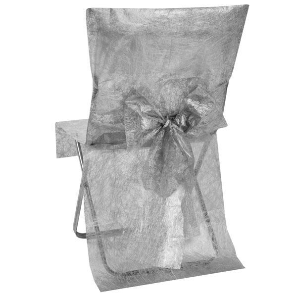Conjunto de 2 capas cobre cadeiras em poliéster (não tecido) em prateado metalizado com um laço nas costas. Pode adaptar a qualquer tipo de cadeira sem braços. Muito fácil de colocar. Ideal para decorar festas de casamento, batizados e outros eventos.