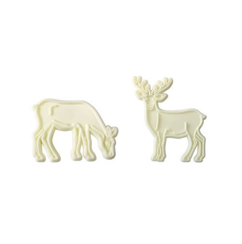 Inclui um cortador de rena fêmea medindo 6 x 4 cm com a cabeça baixa e um cortador de rena macho medindo 7 x 8 cm com a cabeça erguida.