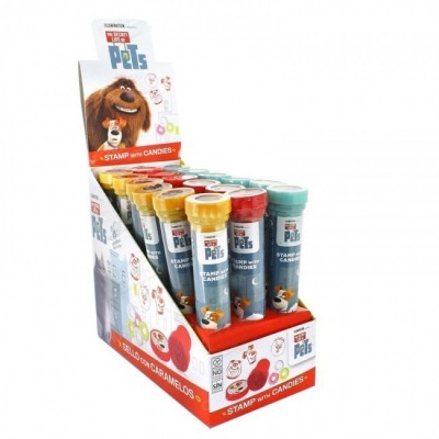Tubo com docinhos em argola sortidos com imagens das personagens do filme Pets - A Vida Secreta dos Bichos. Ótimos para brinde de aniversário. A tampa do tubo é também um carimbo. Capacidade: 10gr.Sem gluten.