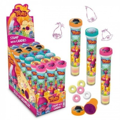 Tubo de doces circulares sortidos com imagens das personagens do filme os Trolls. A tampa do tubo é também um carimbo. Capacidade: 10gr.Sugestão: artigo usado ocmo brinde de aniversário.