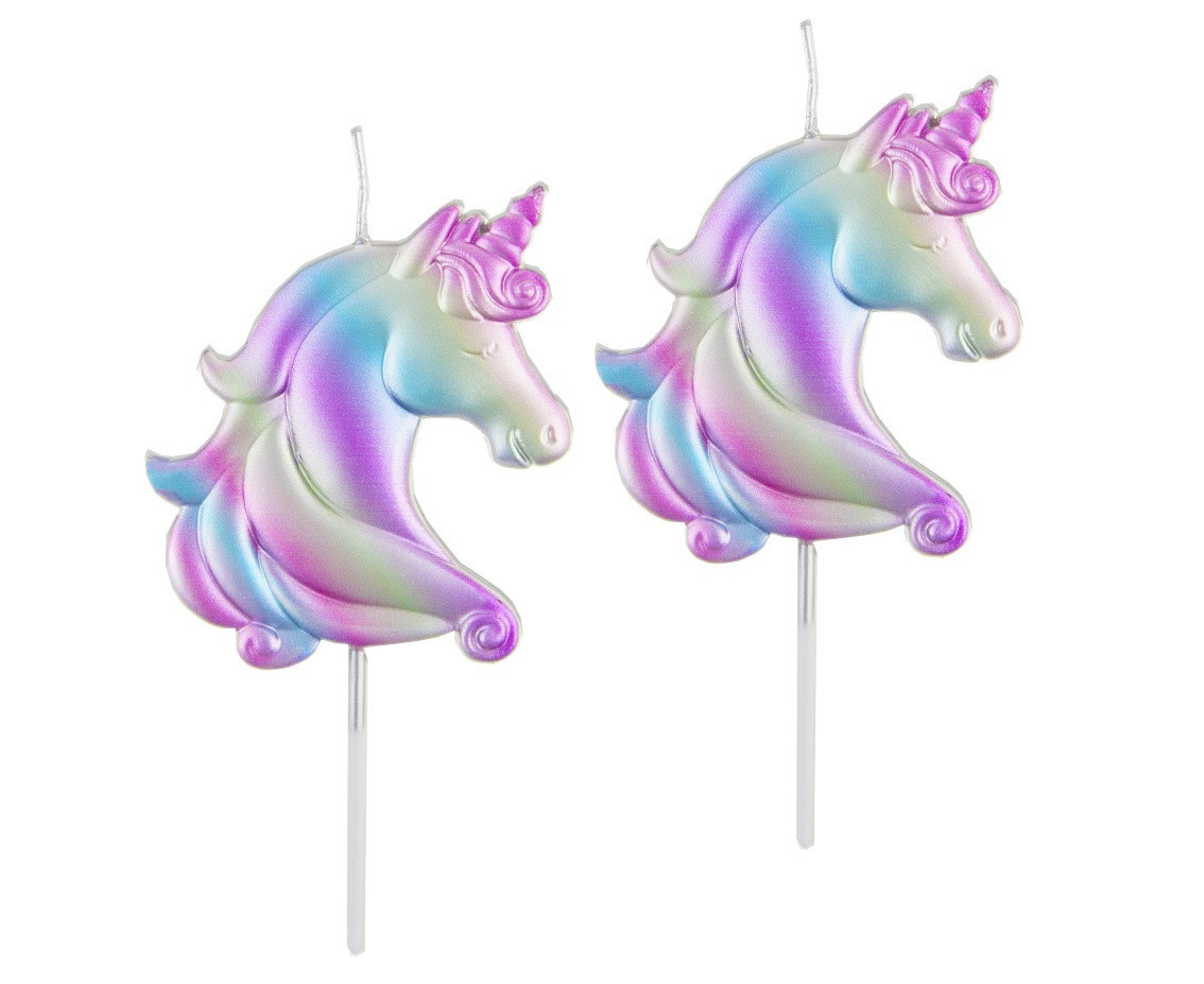 Conjunto de duas velas para bolo de aniversário de unicórnios em iridescente metálico.