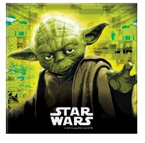 Guardanapos de folha dupla com as classicas ilustrações de Star Wars, num dos lados a cara do maestro Yoda e na outra um soldado imperial.