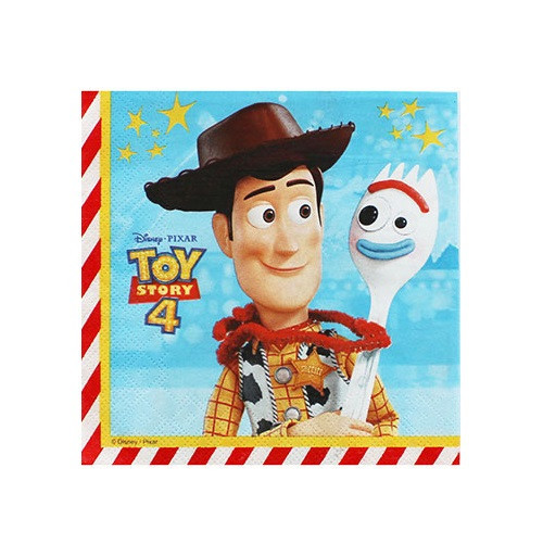 Embalagem de 20 guardanapos do filme do Toy Story 4 da Disney com o Woody e o Forky na parte da frente e a Betty na parte de trás, para a tua festa de aniversário.