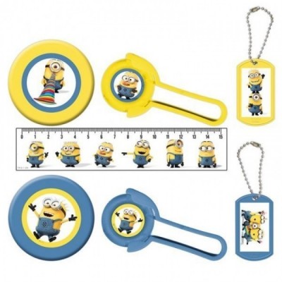 Contem 6 discos , 6 atira-discos, 6 placas de identificação e 6 réguas, tudo para se divertir e fazer tropelias nas festas de aniversário dos Minions.