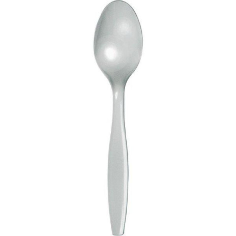 Pack de 24 unidades de colheres de sobremesa de plástico em prateado. Ideal para festas aniversário e outros eventos.
