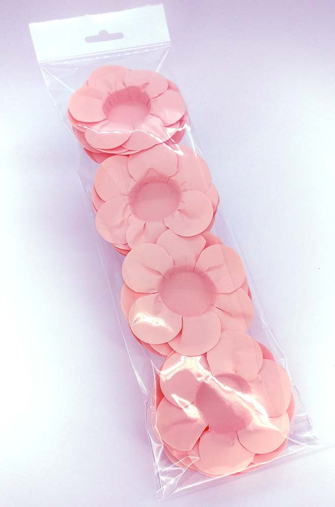 Conjunto de 24 forminhas em papel de 90 gramas para brigadeiros ou outros docinhos em forma de flor com pétalas em tom salmão pastel ou coral.