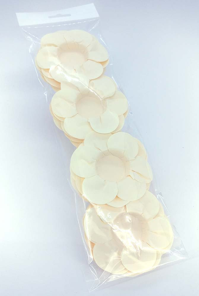 Conjunto de 24 forminhas em papel de 90 gramas para brigadeiros ou outros docinhos em forma de flor com pétalas em tom pérola ou marfim.
