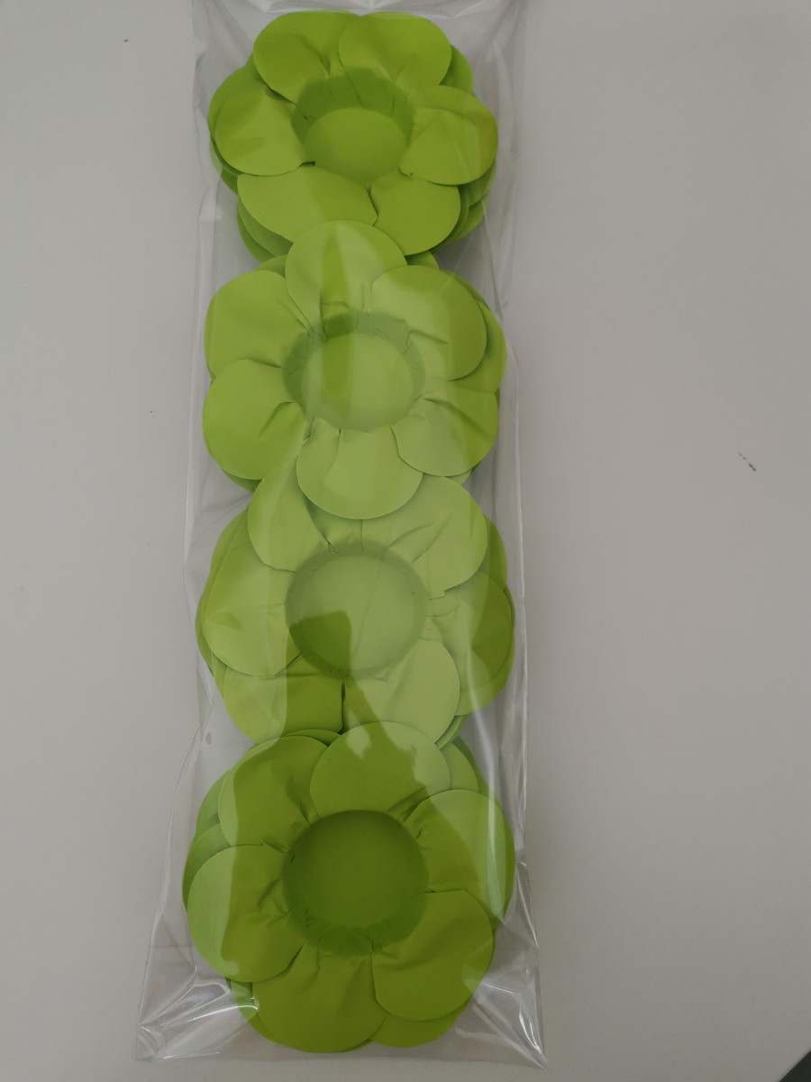 Conjunto de 24 forminhas em papel de 90 gramas para brigadeiros ou outros docinhos em forma de flor com pétalas no tom verde lima.