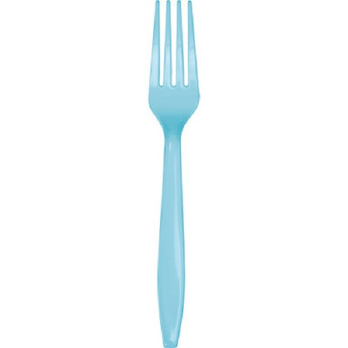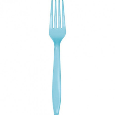 Pack de 24 unidades de garfos de plástico em azul claro. Ideal para festas aniversário e outros eventos.