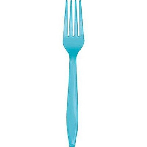 Pack de 24 unidades de garfos de plástico em azul turquesa. Ideal para festas aniversário e outros eventos.
