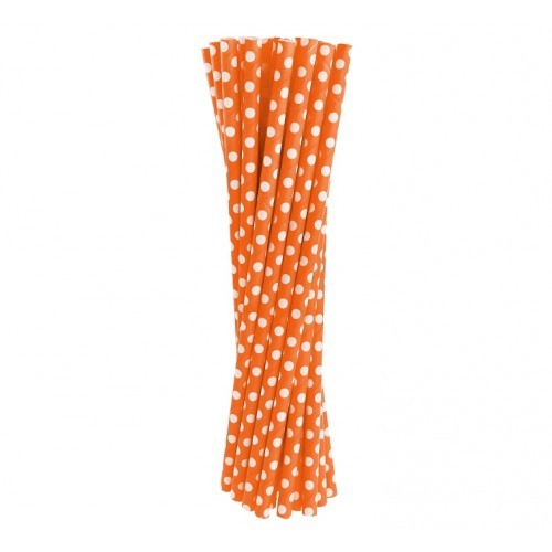 Pack de 24 palhinhas de papel descartáveis na cor laranja com bolinhas brancas.