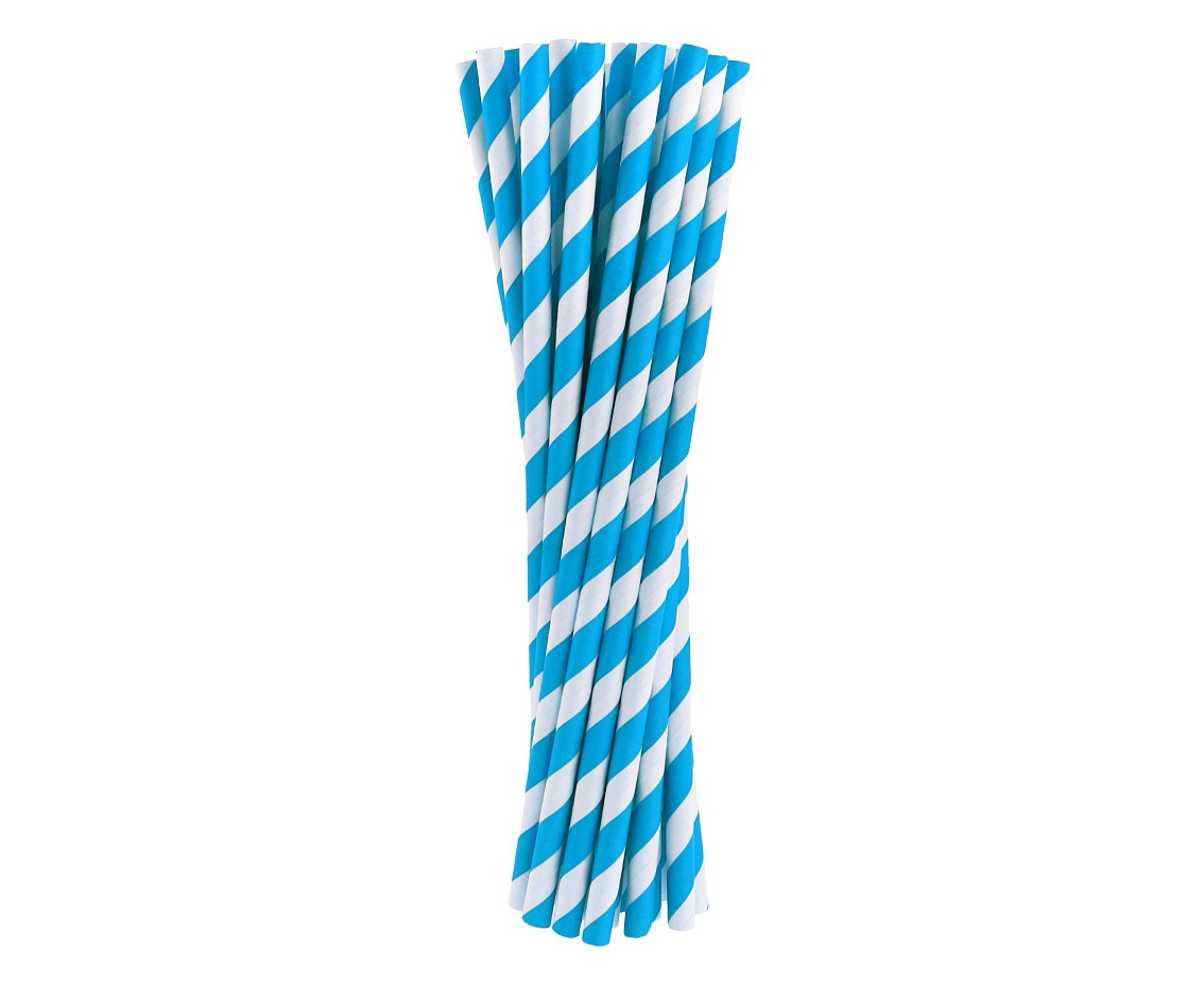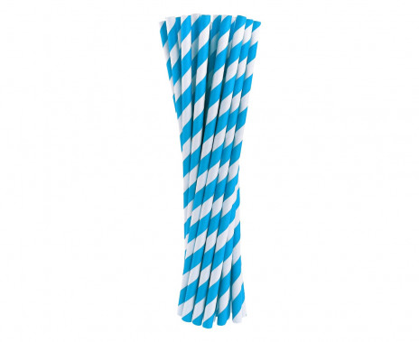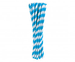 Palhinhas em papel de cor azul com listas brancas com cerca de 20cm de comprimento.