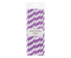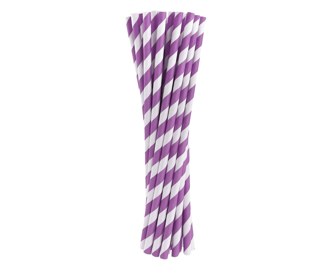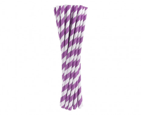 Palhinhas em papel de cor lavanda com listas brancas com cerca de 20cm de comprimento.