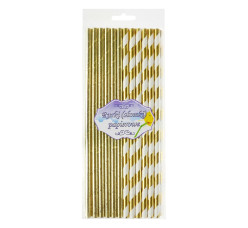 Palhinhas em papel de cor dourada com listas brancas e todas douradas com cerca de 20cm de comprimento. Cada conjunto contém 24 palhinhas, 12 de cada motivo.