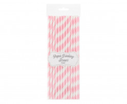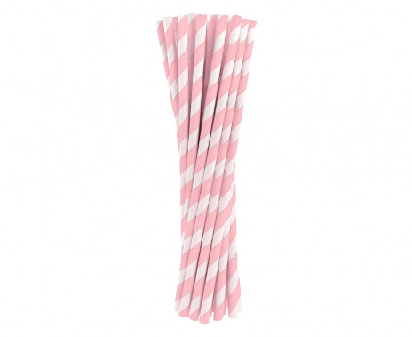 Palhinhas em papel de cor rosa claro com listas brancas com cerca de 20cm de comprimento.