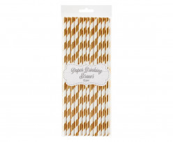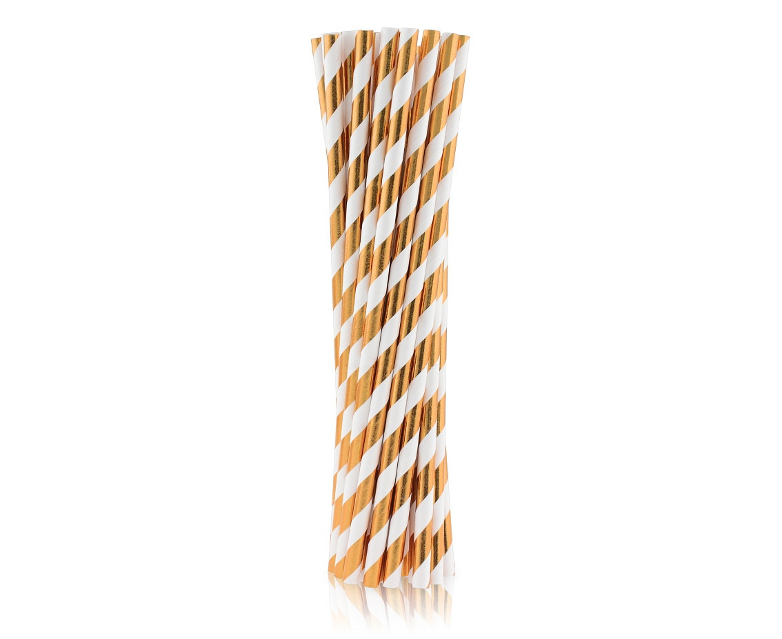 Palhinhas em papel de cor rose gold com listas brancas com cerca de 20cm de comprimento.