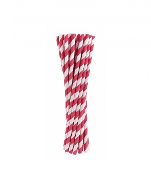 Pack de 24 palhinhas de papel descartáveis na cor branca com riscas diagonais rosa escuras.